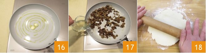 Entre-temps, laissez parfumer l'ail dans une poêle avec un filet d'huile 16 puis retirez ce dernier et faites sauter les champignons pendant 2-3 minutes, après quoi déglacez avec le vin blanc 17 et dès qu'il sera évaporé, éteignez le feu et laissez refroidir complètement. Reprenez la pâte brisée et étalez-la sur un plan de travail légèrement fariné à environ 0,5 cm d'épaisseur 18,