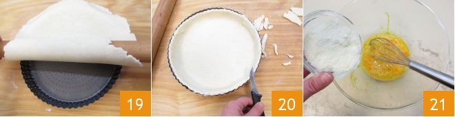 enroulez la pâte autour du rouleau à pâtisserie et placez-la dans un moule perforé (si vous ne l'avez pas, alors procédez en beurrant et farinant d'abord) 19 ; éliminez les excès de pâte avec un couteau 20. Dans un grand bol, versez les œufs et mélangez avec le pecorino 21,