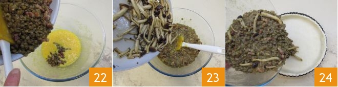 ajoutez les lentilles 22 et les chiodini 23, ajustez le sel et le poivre, et après avoir bien amalgamé, versez le mélange dans le moule 24.