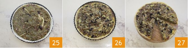 Nivelez 25 et faites cuire dans le four statique préchauffé à 200°C pendant 30 minutes, puis abaissez la température à 170°C et faites cuire encore pendant 20 minutes 26. Laissez tiédir avant de la retirer du moule et servez votre tarte salée aux champignons et lentilles 27 !