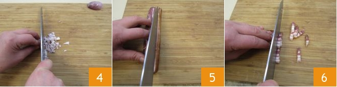 Entre-temps, occupez-vous de la garniture : épluchez et hachez finement l'échalote 4. Ensuite, retirez la couenne de la poitrine fumée 5 et coupez-la en lanières de 5 mm 6.