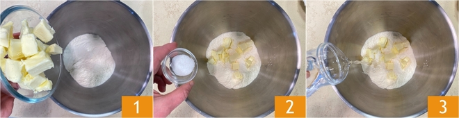 Pour préparer la tarte salée aux fèves et pecorino, commencez par réaliser la pâte : dans la cuve d'un robot pâtissier équipé du batteur plat, versez la farine 1, le beurre froid en dés, le sel 2 et l'eau 3.