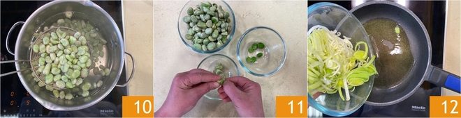 Égouttez les fèves 10 et laissez-les tiédir juste ce qu'il faut pour pouvoir enlever la peau extérieure sans vous brûler 11. À ce stade vous obtiendrez environ 400 g de fèves : transférez-en 300 g dans un bol et 100 g dans un autre. Dans une poêle, chauffez un filet d'huile et ajoutez le poireau 12.