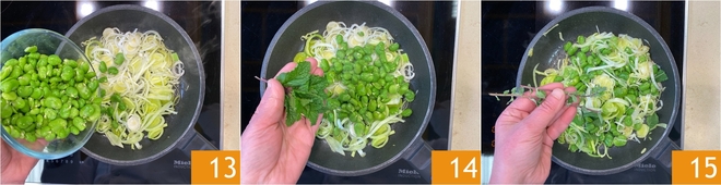 Laissez-le s'attendrir quelques minutes, puis ajoutez les 300 g de fèves 13, les petites feuilles de menthe 14 et la marjolaine 15.