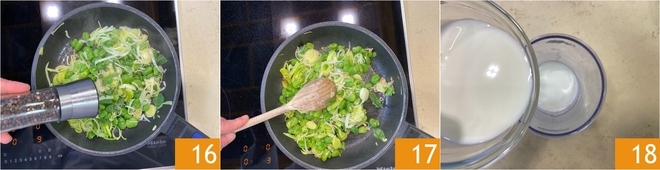 Assaisonnez de sel et de poivre 16, puis faites cuire à feu moyen pendant 5 minutes 17. Pendant ce temps, versez le lait et la crème dans un récipient à bords hauts 18.