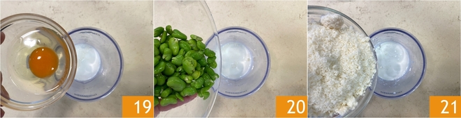 Ajoutez l'œuf 19, les 100 g de fèves 20 et le pecorino râpé 21.