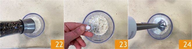 Poivrez 22, salez 23 et mixez le tout au mixeur plongeant 24.
