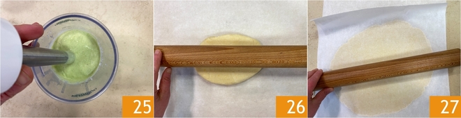 Vous devez obtenir une crème lisse 25. Reprenez maintenant la pâte brisée, posez-la sur un plan fariné et commencez à l'étaler 26 jusqu'à obtenir une épaisseur de 2-3 mm 27 ; si vous préférez, vous pouvez l'étaler entre deux feuilles de papier cuisson, ainsi vous n'aurez pas besoin d'ajouter davantage de farine pour éviter qu'elle ne colle au plan de travail.