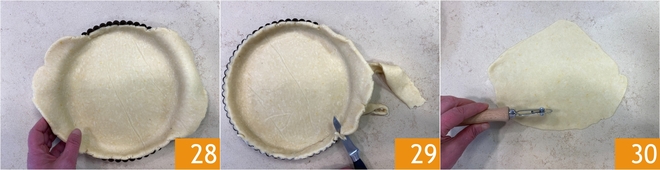 Transférez le disque de pâte dans un moule à tarte de 24 cm de diamètre 28 et, avec les mains, faites-le bien adhérer à tous les bords. À l'aide d'un couteau bien affûté, enlevez l'excédent de pâte 29 et pétrissez-le de nouveau. Étalez le pâton restant pour obtenir des bandes de 2 cm de large avec une roulette crantée 30.