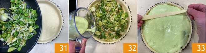 Versez dans le fond de pâte brisée la garniture de légumes 31 et la crème de fèves et pecorino 32. Disposez maintenant les bandes de pâte sur la surface 33.