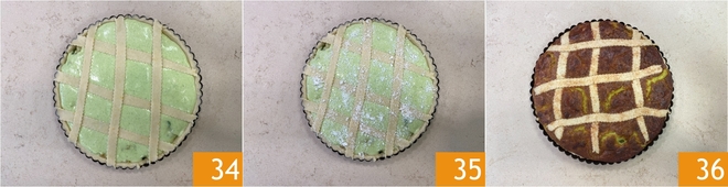 Disposez-les d'abord dans un sens puis dans l'autre, de façon à former des losanges 34. Enfin, parsemez la surface de la tarte salée du pecorino restant 35. Faites cuire dans un four statique préchauffé à 180 °C, sur la grille du milieu, pendant 60 minutes. Sortez-la du four et laissez refroidir la tarte salée aux fèves et pecorino avant de la servir 36 !