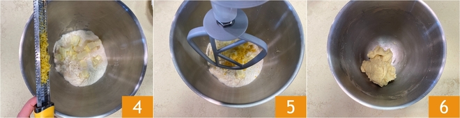Parfumez avec le zeste râpé du citron 4 et faites tourner l'appareil 5 jusqu'à obtenir une pâte compacte et homogène 6.