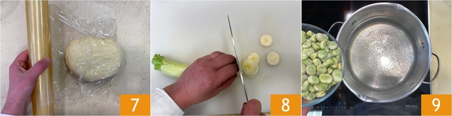 Transférez la pâte sur le plan de travail, travaillez-la encore quelques instants et enveloppez-la dans un film alimentaire 7. Laissez à température ambiante jusqu'à l'utilisation. Passez à la garniture : nettoyez le poireau et coupez-le en rondelles 8. Faites cuire les fèves écossées dans de l'eau bouillante pendant 5 minutes 9.