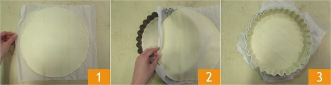 Pour préparer la tarte de pâte feuilletée caprese, commencez par prendre le rouleau de pâte feuilletée et étalez-le délicatement sur un plan de travail 1. Transférez ensuite dans un moule festonné de 25 cm 2 et faites bien adhérer la pâte sur tous les bords 3.