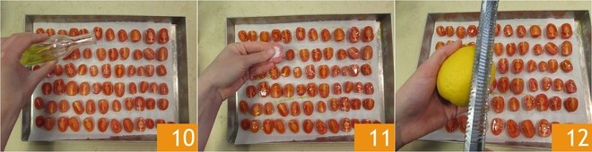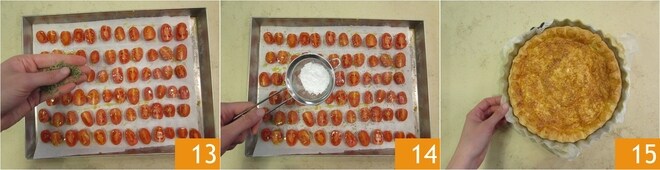 origan 13 et enfin le sucre glace 14, tamisé avec un petit tamis. Lorsque la pâte est bien dorée, sortez-la du four 15 et laissez-la refroidir. Augmentez la température du four à 220° et faites cuire les tomates cerises pendant 30 minutes.
