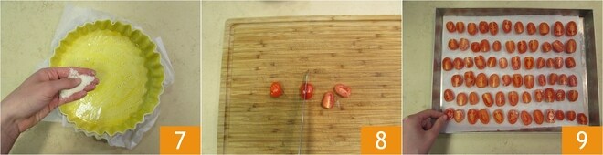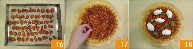 et saupoudrez la base de Grana râpé 7. Faites cuire dans un four statique préchauffé à 180° pendant environ 30 minutes. Pendant que la pâte cuit, occupez-vous des tomates cerises confites. Commencez par les laver et les sécher. Disposez-les sur une planche à découper et coupez-les en deux 8. Disposez-les au fur et à mesure sur une plaque avec du papier cuisson, face coupée vers le haut 9