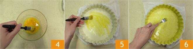 Dans un petit bol, battez un œuf 4 et utilisez-le pour badigeonner toute la surface de la pâte feuilletée 5. Piquez la base avec les dents d'une fourchette 6