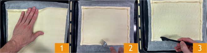 Pour préparer la tarte salée d'été, commencez par dérouler la pâte feuilletée directement sur la plaque du four. Repliez les bords de la pâte d'environ un centimètre vers l'intérieur 1. Piquez la base avec une fourchette 2 et badigeonnez de lait 3.