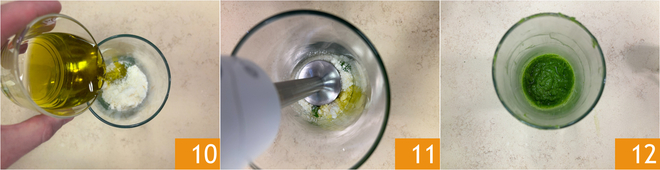 Enfin, versez l'huile 10 et mixez par petites impulsions (pour ne pas trop chauffer le mélange) 11 jusqu'à obtenir une sauce homogène 12.