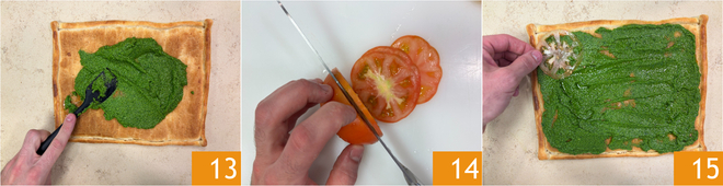 Étalez le pesto sur toute la base de la pâte 13. Coupez la tomate en tranches très fines 14 et disposez-les sur la surface, en les superposant légèrement 15.