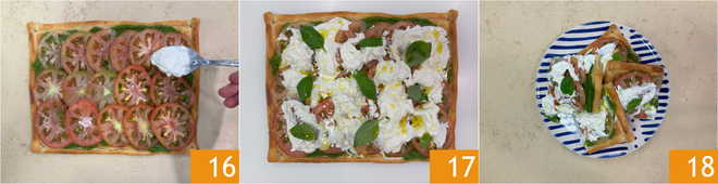 Répartissez la stracciatella sur les tomates 16 et, enfin, garnissez avec les feuilles de basilic, une pincée de sel et un filet d'huile 17. Votre tarte salée d'été est prête à être dégustée 18 !