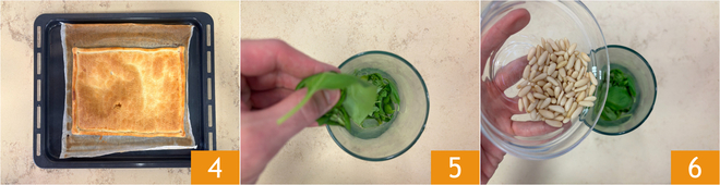 Faites cuire la base dans un four ventilé préchauffé à 200° pendant environ 10 minutes. Lorsqu'elle est dorée sur les bords, sortez-la du four et laissez refroidir 4. Pendant ce temps, préparez le pesto : dans le bol du mixeur, mettez les feuilles de basilic lavées et séchées 5 et les pignons de pin 6.