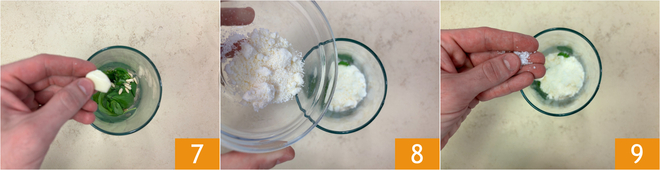 Ajoutez également l'ail dont vous avez retiré le germe 7, le pecorino et le parmesan râpés 8 et le gros sel 9.