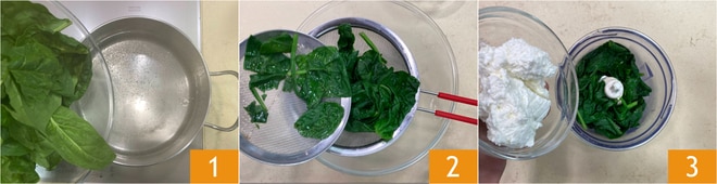 Pour préparer la tarte salée de Noël, commencez par blanchir les épinards 1, égouttez-les bien 2, puis mettez-les dans un mixeur et ajoutez la ricotta 3.