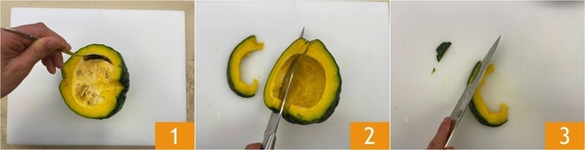 Pour préparer la tarte salée potiron et mozzarella, commencez par couper le potiron en deux et retirez les graines à l'intérieur 1. Ensuite, coupez-le en tranches épaisses 2 et retirez la peau avec un couteau 3.