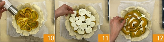 Assaisonnez avec du sel 10 et placez dessus la mozzarella coupée en tranches 11. Terminez avec le reste de potiron 12.