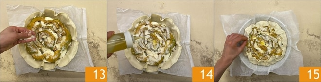 Ajoutez dessus le fromage râpé 13, un filet d'huile 14 et repliez vers l'intérieur les bords de la pâte vers la garniture 15.