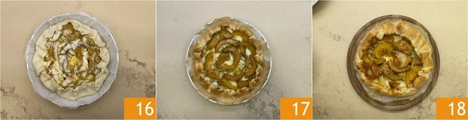 À ce stade, vous pouvez cuire votre tarte salée 16, enfournez-la dans un four ventilé préchauffé à 180°C pendant 20-30 minutes. Sortez-la du four lorsqu'elle sera bien dorée 17 et laissez tiédir avant de la démouler et de la servir 18.