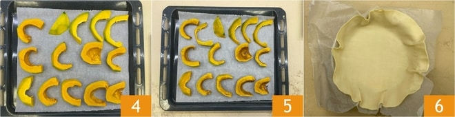 Disposez au fur et à mesure les tranches de potiron sur une plaque recouverte de papier sulfurisé 4 et faites cuire dans un four ventilé préchauffé à 200°C pendant 15 minutes. Lorsque le potiron sera tendre, vous pourrez le sortir du four 5. Laissez-le refroidir et en attendant, coupez la mozzarella en tranches et disposez-la sur un plateau avec du papier absorbant. Déroulez la pâte feuilletée dans un moule à tarte évasé de 22 cm à la base et 26 cm dans la partie haute 6.