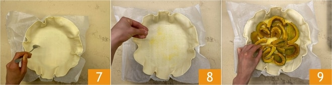 Piquez le fond avec les dents d'une fourchette 7 et saupoudrez la base de farine de maïs 8; cela servira à absorber les éventuels liquides de la mozzarella et du potiron. Disposez maintenant les tranches de potiron 9.