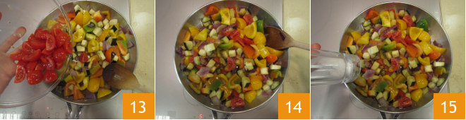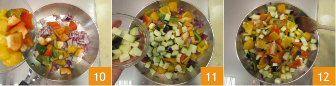 Ajoutez dans la poêle les poivrons 10, les courgettes et les aubergines 11. Mélangez et laissez cuire une ou deux minutes 12.