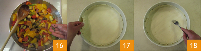 et ajoutez les petites feuilles de thym 16. Faites cuire encore 5 minutes à feu vif. Les légumes doivent rester encore croquants. À ce stade, coupez le feu et laissez refroidir pendant au moins 10 minutes. Déroulez délicatement la pâte feuilletée et placez-la dans un moule de 28 cm 17. Piquez le fond avec les dents d'une fourchette 18
