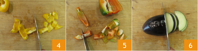 Coupez-le d'abord en lanières puis en morceaux d'environ 2 cm 4. Faites de même avec le poivron rouge 5. Prenez une aubergine, retirez les extrémités et coupez-la d'abord en tranches 6