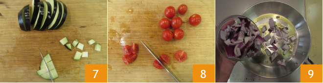 puis en dés 7. Coupez les tomates cerises en quartiers 8. Versez un filet d'huile dans une sauteuse, ajoutez l'oignon et faites-le revenir pendant une minute ou deux 9.