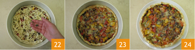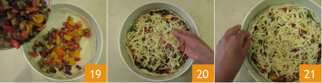et transférez-y les légumes refroidis 19. Ajoutez l'Edam râpé en utilisant les gros trous de la râpe 20 et rabattez l'excédent de pâte des bords vers l'intérieur, sur la garniture 21.