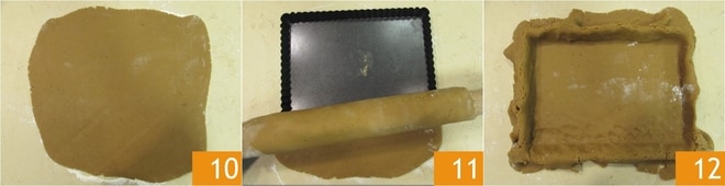 Après le temps de repos, étalez la pâte sur un plan légèrement fariné jusqu'à une épaisseur de 4-5 mm 10. Vous pouvez aussi l'étaler entre deux feuilles de papier sulfurisé. Enroulez la pâte autour du rouleau à pâtisserie et déroulez-la dans un moule rectangulaire de 20x28 cm 11. Appuyez avec les doigts pour qu'elle adhère à la base et aux bords 12 et éliminez l'excédent de pâte avec un couteau.