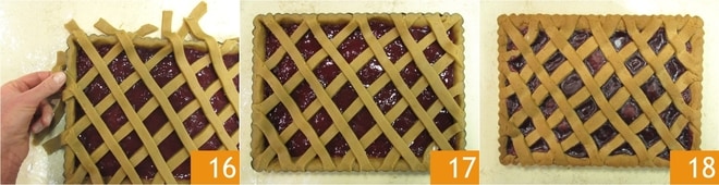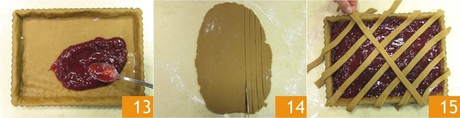 Garnissez le fond de pâte avec la confiture de framboises en l'étalant avec le dos d'une cuillère 13. Recombinez rapidement les chutes de pâte, étalez-la à nouveau à une épaisseur de 4-5 mm et découpez des bandes de 1,5 cm de large 14. Disposez les bandes de pâte en travers sur la confiture, d'abord dans un sens puis dans l'autre 15.
