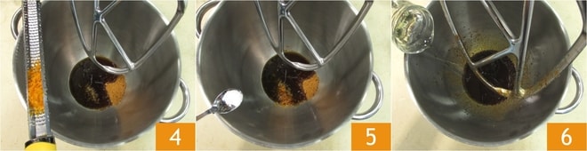 Ajoutez également le zeste d'orange râpé 4 et le sel 5. Mettez le robot en marche à basse vitesse et mélangez pendant une minute, puis versez l'huile de graines 6.