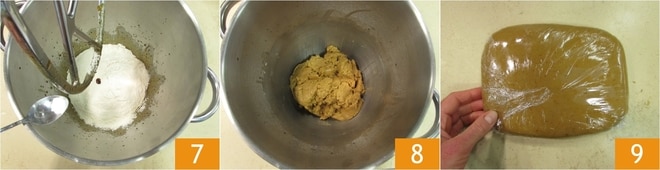 Ajoutez la farine et le bicarbonate 7 et mélangez le tout avec la feuille jusqu'à obtenir une pâte douce et homogène 8. Transférez la pâte sur le plan de travail, formez un pâton et enveloppez-le dans du film alimentaire 9. Laissez reposer la pâte au réfrigérateur pendant au moins une heure.