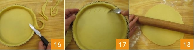 Exercez une légère pression pour faire adhérer le fond et les bords, puis avec un couteau, coupez l'excès de pâte du bord 16. À ce stade, piquez le fond de la base avec les dents d'une fourchette 17. Placez le moule au réfrigérateur, puis reprenez le quart de pâte mis de côté, étalez-le avec le rouleau à pâtisserie jusqu'à environ 3-4 mm d'épaisseur 18.