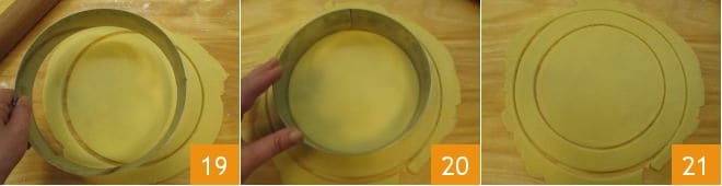 Ensuite, avec un emporte-pièce de 24 cm de diamètre, découpez un disque 19, puis découpez à l'intérieur un autre disque avec un emporte-pièce plus petit, de 18 cm de diamètre 20. De cette façon, vous obtiendrez un anneau de 24 cm de diamètre et un disque de pâte de 18 cm de diamètre 21.