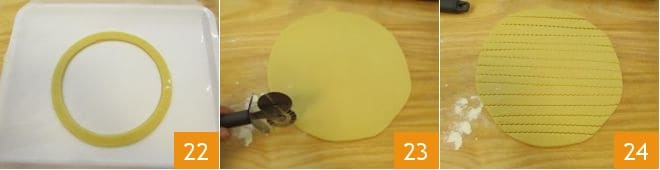 Transférez délicatement l'anneau sur un plateau recouvert de papier sulfurisé 22 et mettez-le au réfrigérateur pour raffermir. Pendant ce temps, avec une roulette à découper dentelée, découpez des bandes d'environ 1 cm de largeur dans le disque de pâte (23-24).