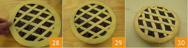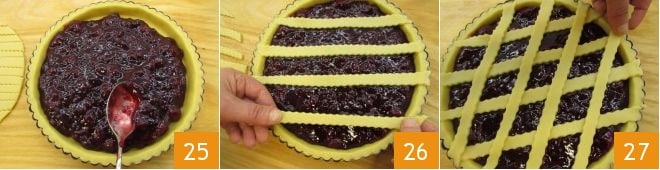 Maintenant, reprenez le moule à tarte et garnissez la base avec la confiture en veillant à la répartir uniformément, en nivelant la surface avec le dos de la cuillère 25. Une fois terminé, appliquez les bandes de pâte bien espacées sur la tarte en faisant adhérer les extrémités au bord 26 ; croisez les bandes pour créer un motif en losange 27.