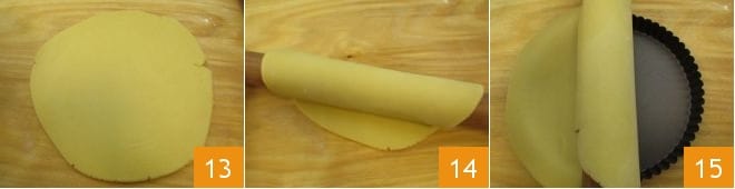 Vous devez obtenir une pâte ronde d'environ 5 mm d'épaisseur 13. Enroulez délicatement le disque de pâte autour du rouleau 14 puis déroulez-le sur un moule à tarte de 24 cm de diamètre 15 : si vous utilisez un moule perforé, il ne sera pas nécessaire de huiler, sinon vous pouvez légèrement huiler le moule avant d'étaler la base.