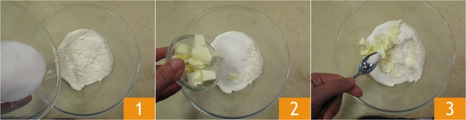 Pour préparer les Tartelettes à la crème de Skyr, poires et noix de cajou, commencez par la pâte sablée. Versez dans un bol la farine, le sucre 1, le beurre froid 2 et une pincée de sel 3.