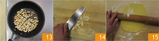 Une fois grillées 13, hachez-les 14. Étalez la pâte sablée à une épaisseur d'environ 7-8 mm 15.